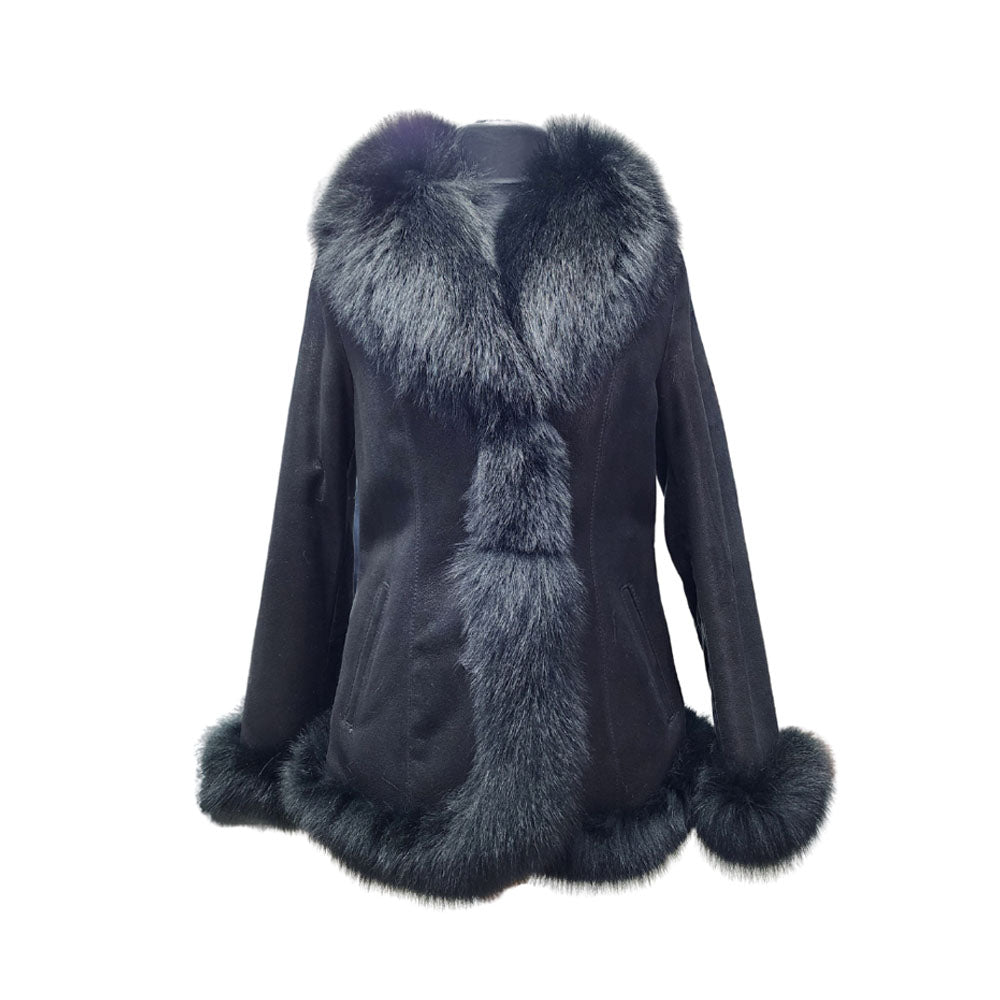 This fall season, come out with the look that will give you an entirely different chic look that can make your appearance iconic by wearing Astrid black shearling coat with fox fur trim. Manufactured with 100% fine Spanish merino double-faced sheepskin shearling which makes it warm and ageless and its 100% sheepskin shearling inner will comfy you as long as you wear it. The strong black color is enough to increase the charm of your persona. The Astrid black shearling coat has been styled by using features like a Real Fox Fur on collar lapels, zipper closure, and open hem fur trim cuffs. Now win the hearts of your friends and people around you through your chic style just by wearing this Women's Shearling Coat.