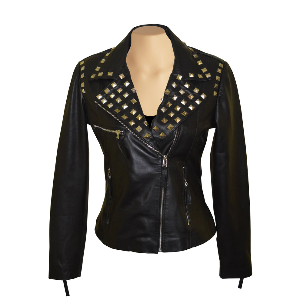 The Aliesha's Biker style jacket with studs is super versatile and can go with almost any look, it can make you the center of all eyes at any party. The premium quality full-grain leather is great construction that combines with soft satin polyester inner to give you moisture-free touch. The beautiful combination of black and golden colors makes it highly elegant. The Aliesha's Biker style jacket features a lapel-style collar with studs, smooth zippered closure, open hem cuffs, and studs detailing making it luxuriant. The Aliesha's Biker-style jacket is the perfect idea to go on.