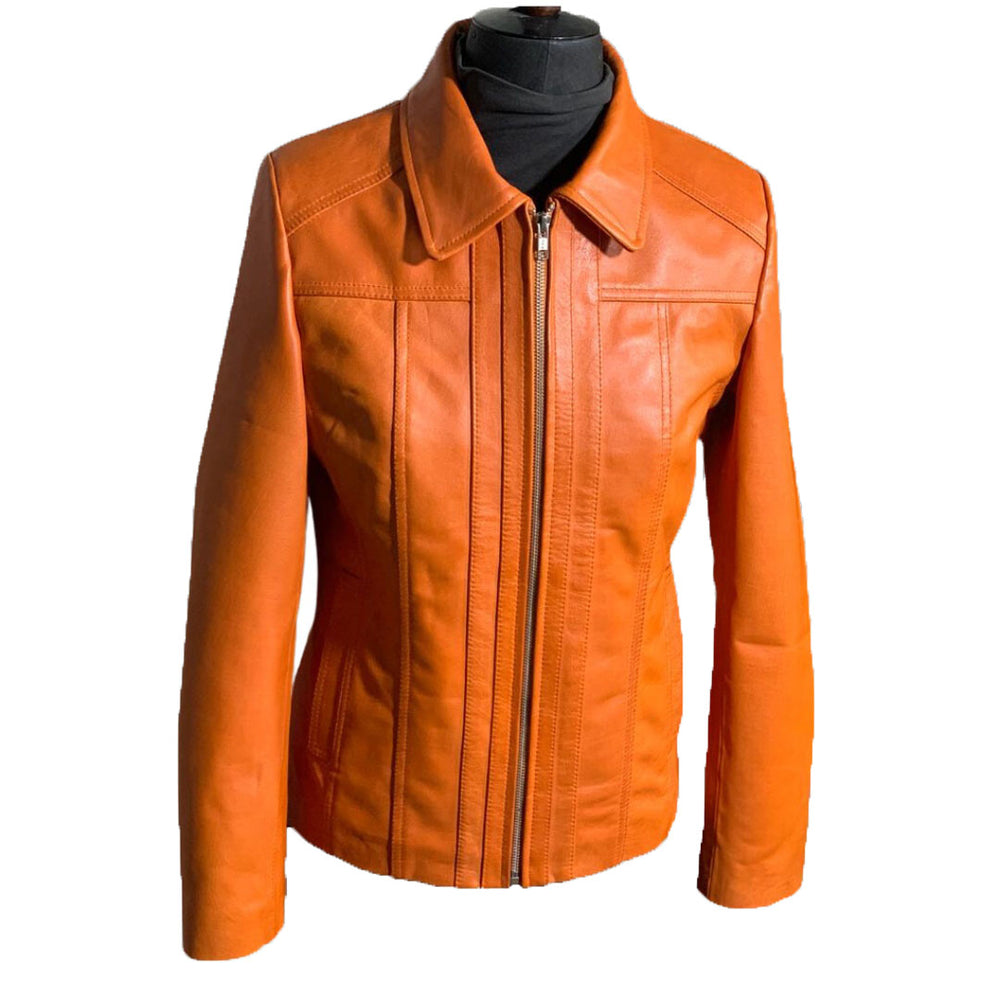 Do you want a stylish and trendy leather jacket having flap collars to mesmerize the crowd? Then, the Amelia women's orange leather jacket - a stunning addition to any wardrobe. Crafted from premium quality leather, this jacket is durable and long-lasting. The vibrant orange color is bold and eye-catching, perfect for those who love to stand out.