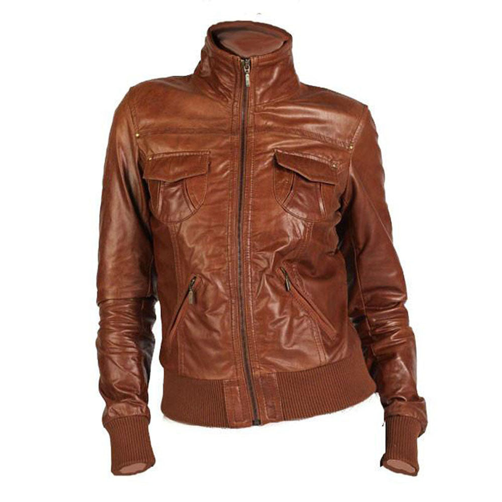 The stylish and trendy zip up leather jacket looks so good in the mesmerizing two toned brown color. The Women's zip up waxed cognac leather jacket with ribbed cuffs and hem is manufactured by using full-grain leather material. On the internal side of this jacket, there is a lining of smooth and soft satin polyester is attached that guards you against cold weather to keep you warm and comfortable. The fine quality stitching makes this jacket durable to wear. There is a straight collar on this leather jacket that looks pretty attractive. On the front side of this jacket, there is a zipper attached for the closure. The Women's zip up waxed cognac leather jacket has ribbed hem and cuffs on full-length style sleeves.